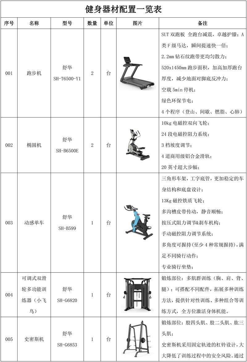 1.kaiyun开云电竞X5智能跑步机SH-T6500*2台-SUT双跑板 全跑台减震,卓越护膝;A类F级马达,瞬间提速快一倍;2.2mm钻石纹跑带更均匀散力;520x1450mm跑步面积,加高加厚跑台厚度,减少地面对脚底反冲力;空载5min停机;绿色环保节电;4个程序(登山、间歇、燃脂、心肺)。
