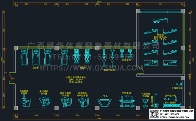 此方案要求面积小于206m²,适用于企事业单位、酒店会所、楼盘社区、工作室、学校等健身场所,能满20-30人同时健身使用。(方案根据场地空间大小、预算、产品需求等进行配置仅为启发性参考)