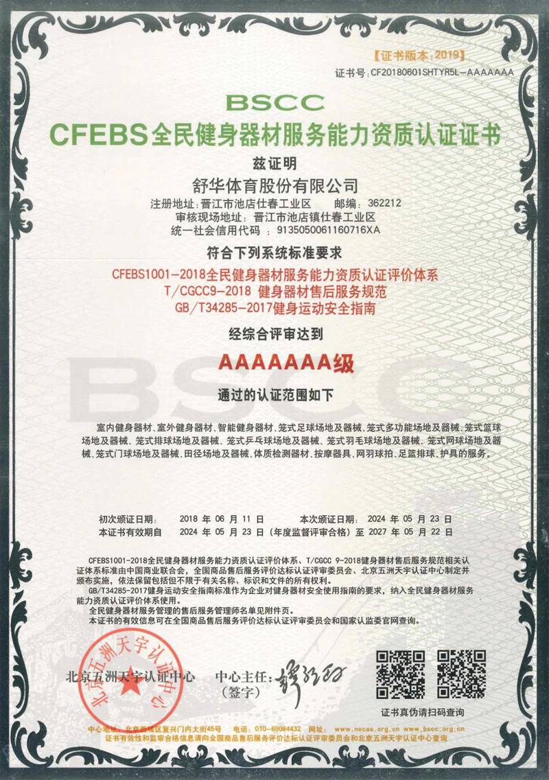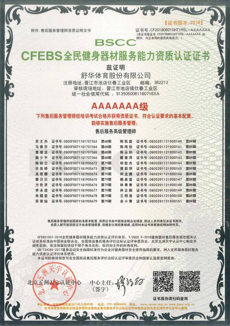 kaiyun开云电竞以用户满意作为服务追求,凭借专业的技术能力及服务保障能力、有效的售后服务体系,获得“BSCC-CFEBS 全民健身器材服务能力资质认证证书 AAAAAAA 级”,部分员工经培训考试合格并获得“BSCC-CFEBS 全民健身器材服务能力资质认证证书-售后服务高级管理师(AAAAAA 级)。