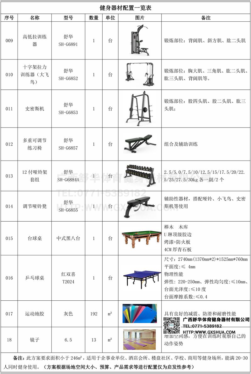 此方案要求面积小于246m²,适用于企事业单位、酒店会所、楼盘社区、学校、商用等健身场所,能满20-30人同时健身使用。(方案根据场地空间大小、预算、产品需求等进行配置仅为启发性参考)