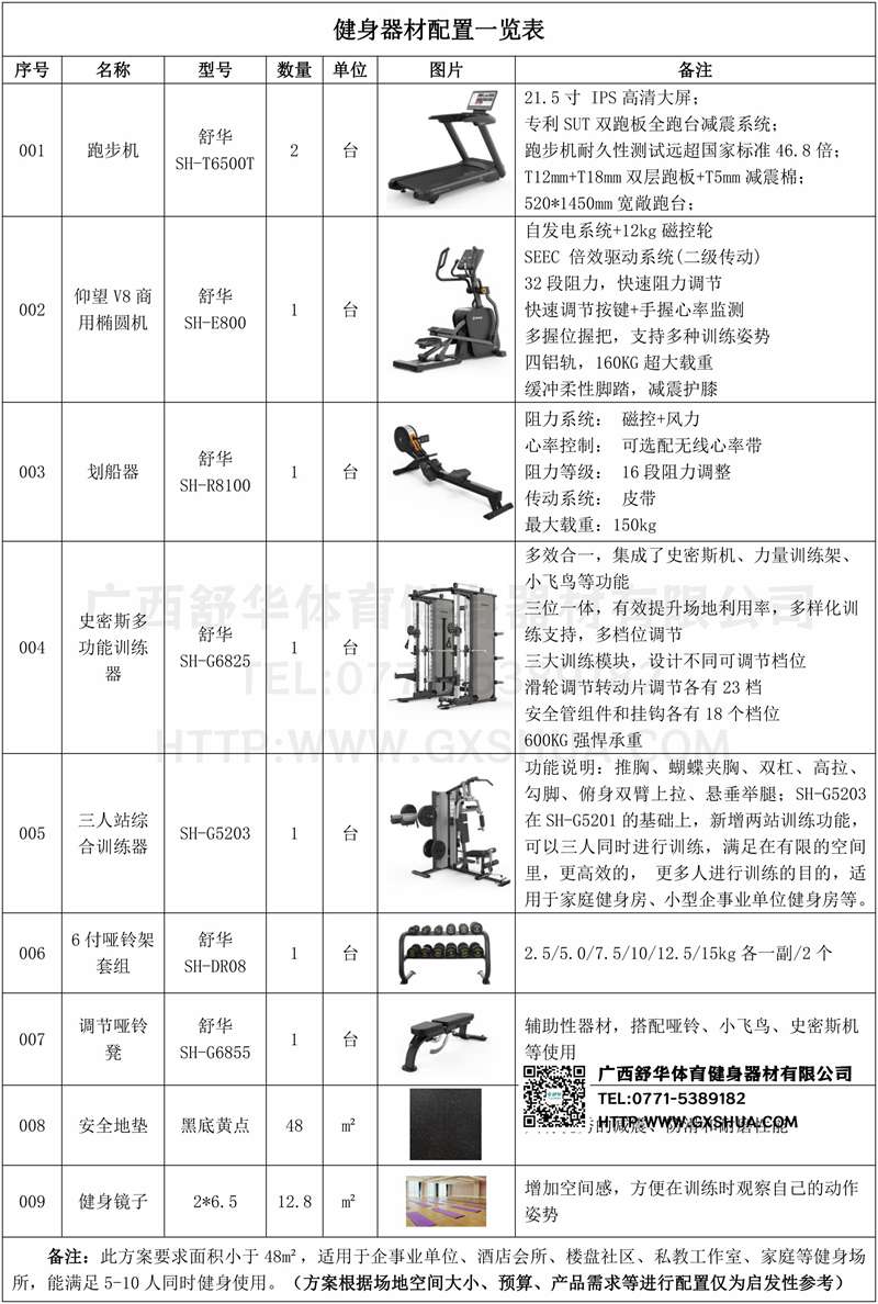 此方案要求面积小于48m²,适用于企事业单位、酒店会所、楼盘社区、私教工作室、家庭等健身场所,能满足5-10人同时健身使用(方案根据场地空间大小、预算、产品需求等进行配置仅为启发性参考)