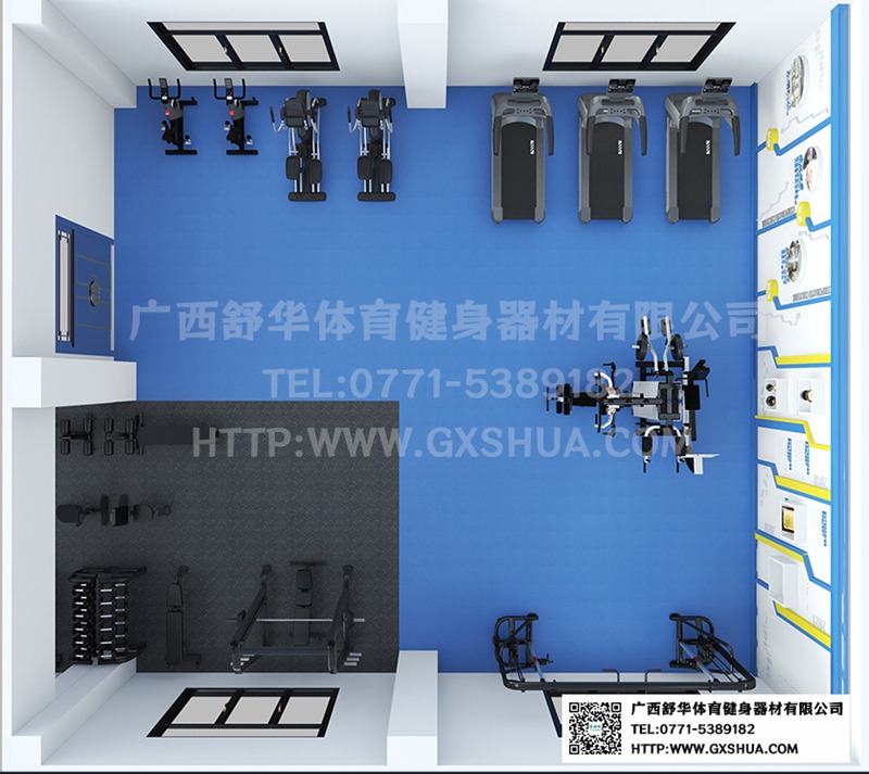110m²企事业单位健身房有氧器材区域配置kaiyun开云电竞跑步机、椭圆机、动感单车、多元化的有氧器材能够有效提升心肺功能;力量器械配置四人站综合训练器、大飞鸟,史密斯机,能够满足健身房中大量用户的高强度训练需求;自由力量区域配置哑铃套组、腹肌板、满足多样化训练需求,促使健身训练更丰富。